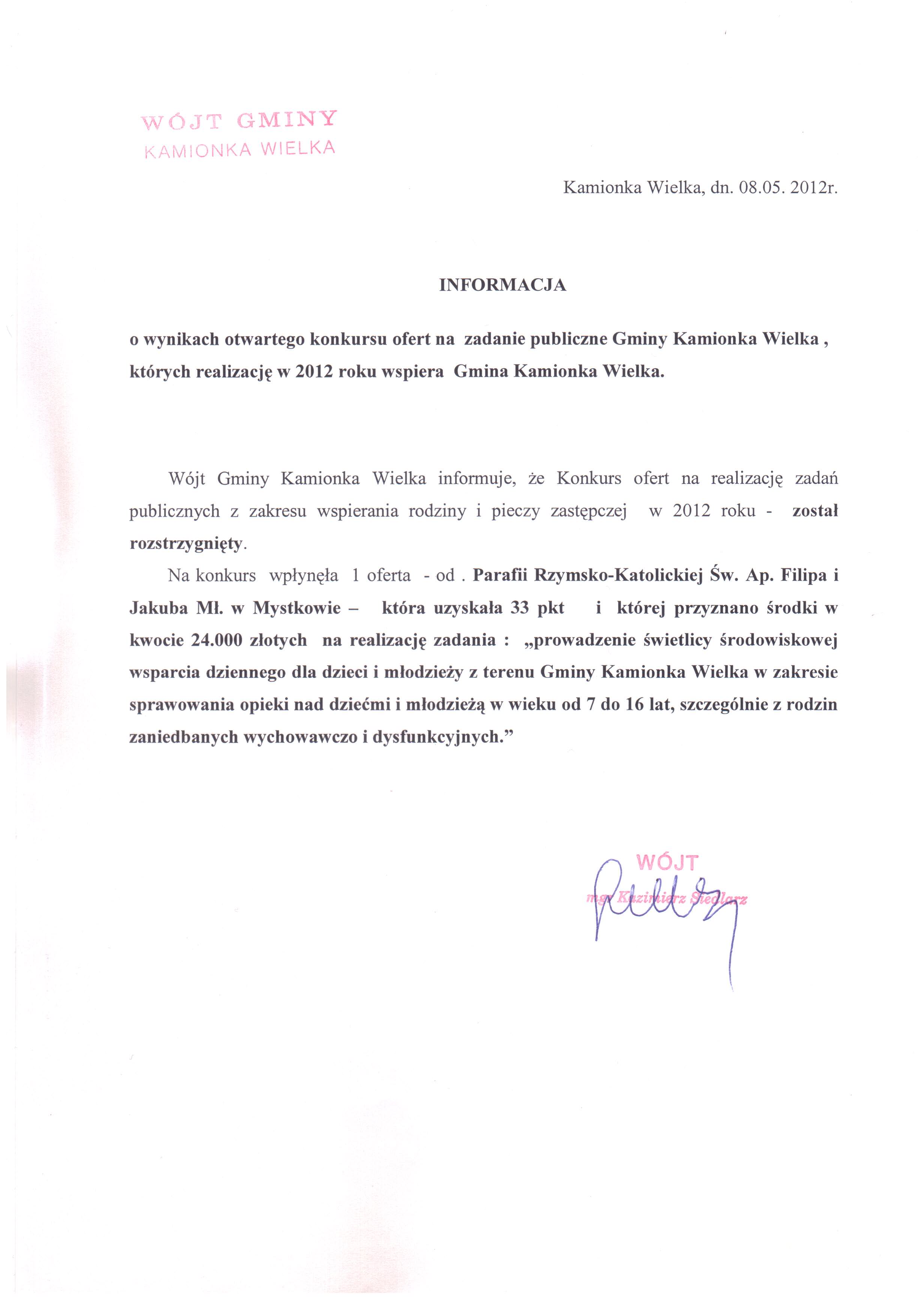 Informacja o wyniku otwartego konkursu ofert na zadanie publiczne Gminy Kamionka Wielka.JPG